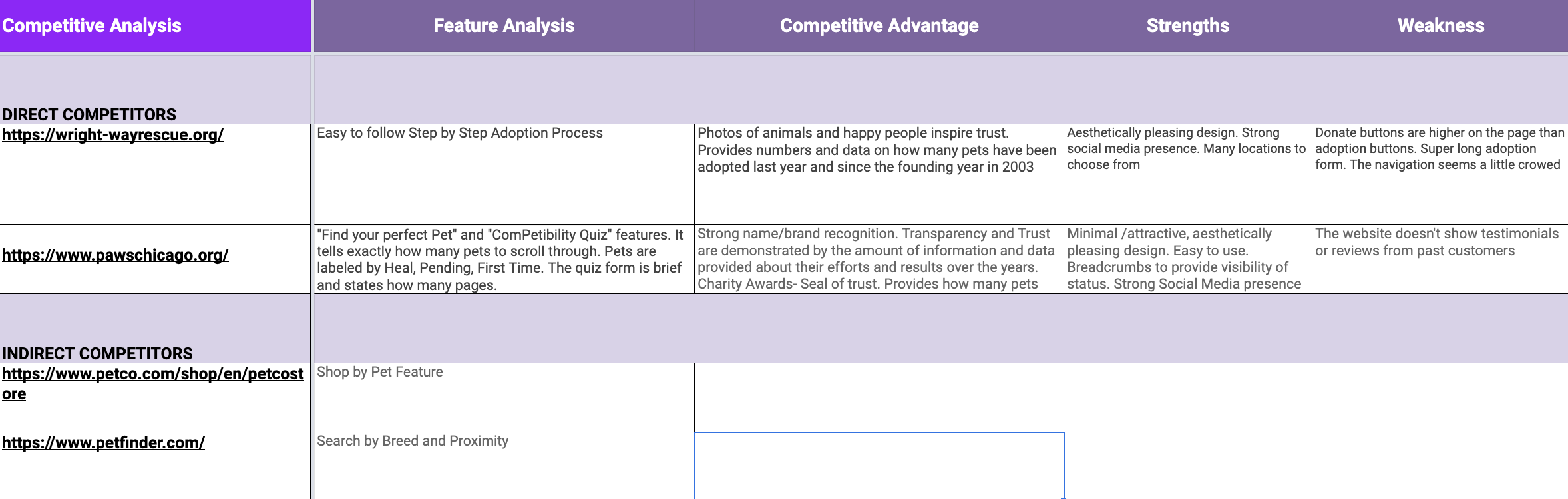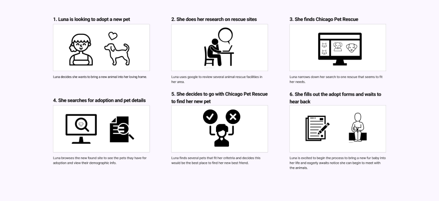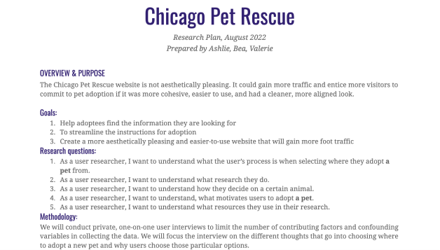 With so many animals in need of care and resources, and people looking for company and connection, often animal lovers feel more motivated to adopt a pet instead of purchasing one. When navigating a pet rescue website, in order to feel motivated to engage in the adoption process, the user needs to have trust in the organization and feel comfortable and satisfied with the amount of information they find. We identified a gap between what the visitors of the site expected and what the website provided. We were able to rethink ways to help the organization’s website serve a bigger purpose and for pet lovers to give back in a manner that provides value to all parties involved.