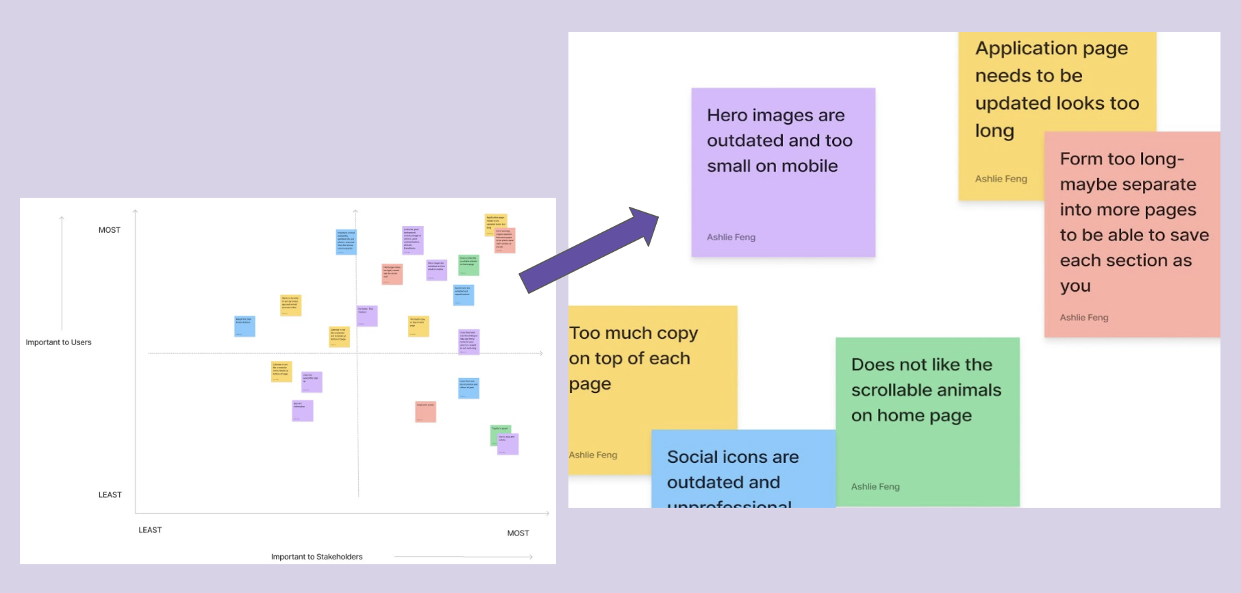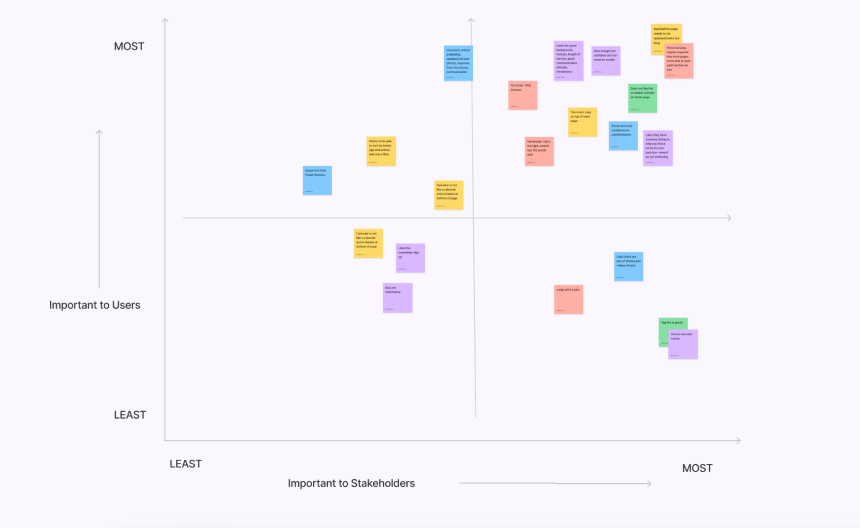 The interview data was organized into an Affinity Diagram which helped us sort and prioritize answers based on recurring themes and categories outlined by the team.