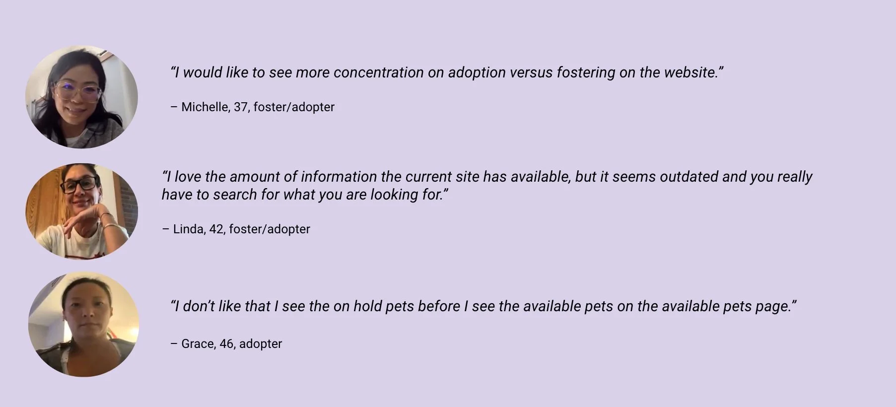 We conducted user interviews to identify the challenges that pet rescuers faced when navigating the site as well as potential solutions to alleviate these pain points.