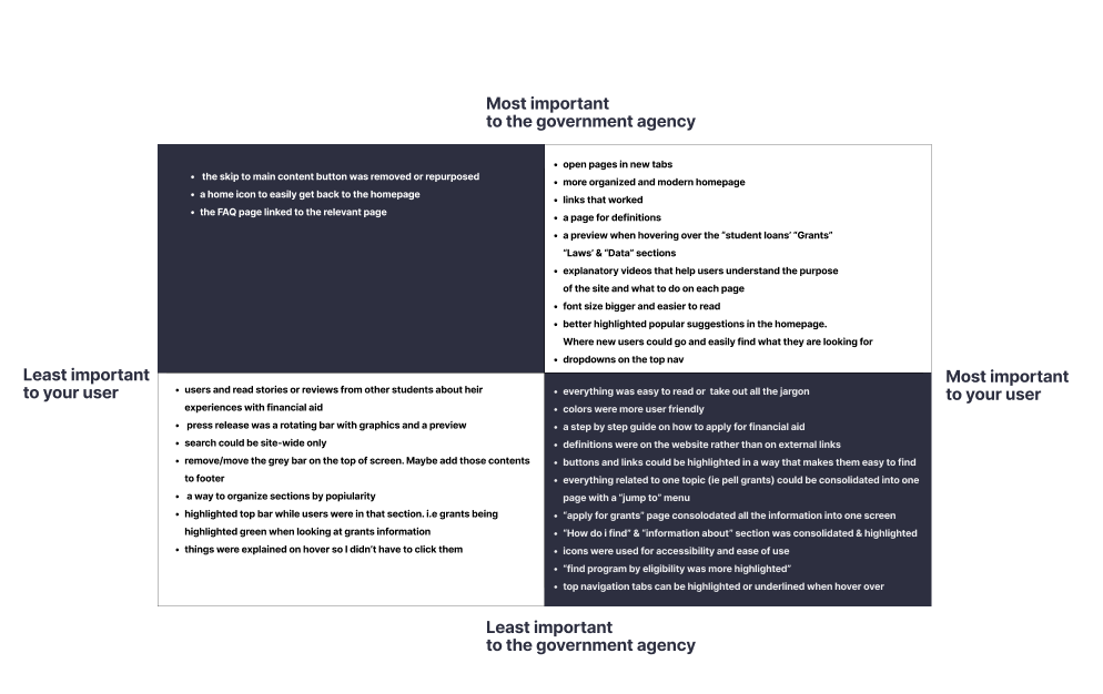 The usability testing feedback was organized using the I like, I wish, What If method and sorted into a prioritization matrix that allowed us to brainstorm a solution to target the most relevant needs of our users.