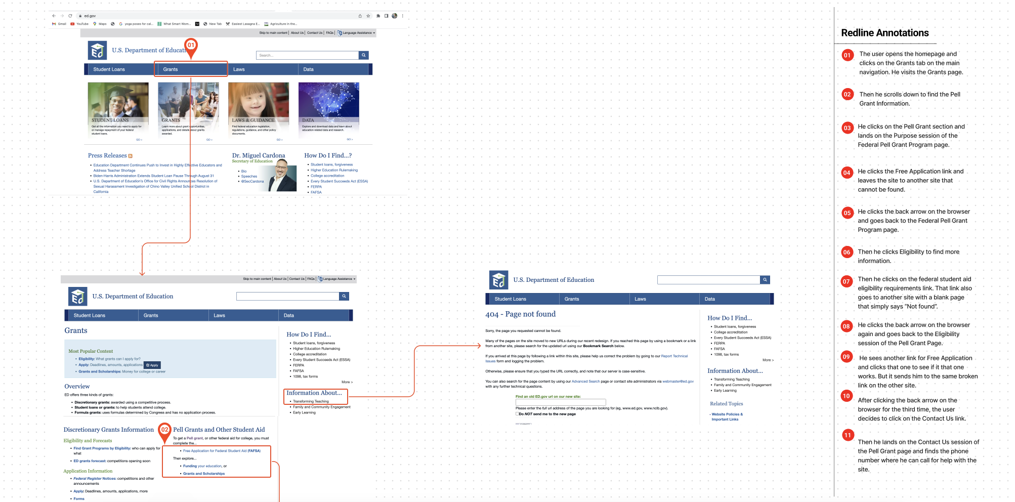 We analyzed a typical user path based on the conclusions of our proto persona. We annotated the path, noting where our users would run into problems based on our understanding of design and heuristic principles.